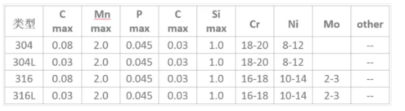 不銹鋼:耐空氣、蒸汽、水等弱腐蝕介質或具有不銹性的鋼種。通常使用的鋼種為304、304L、316、 316L,是奧氏體不銹鋼的300系列鋼。