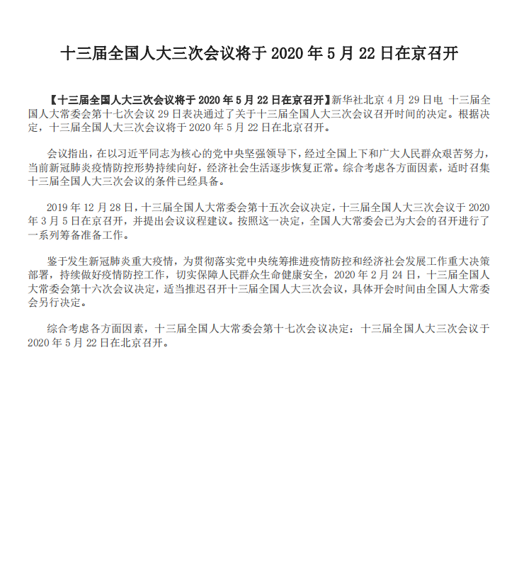 十三屆全國人大三次會(huì)議將于2020年5月22日在京召開